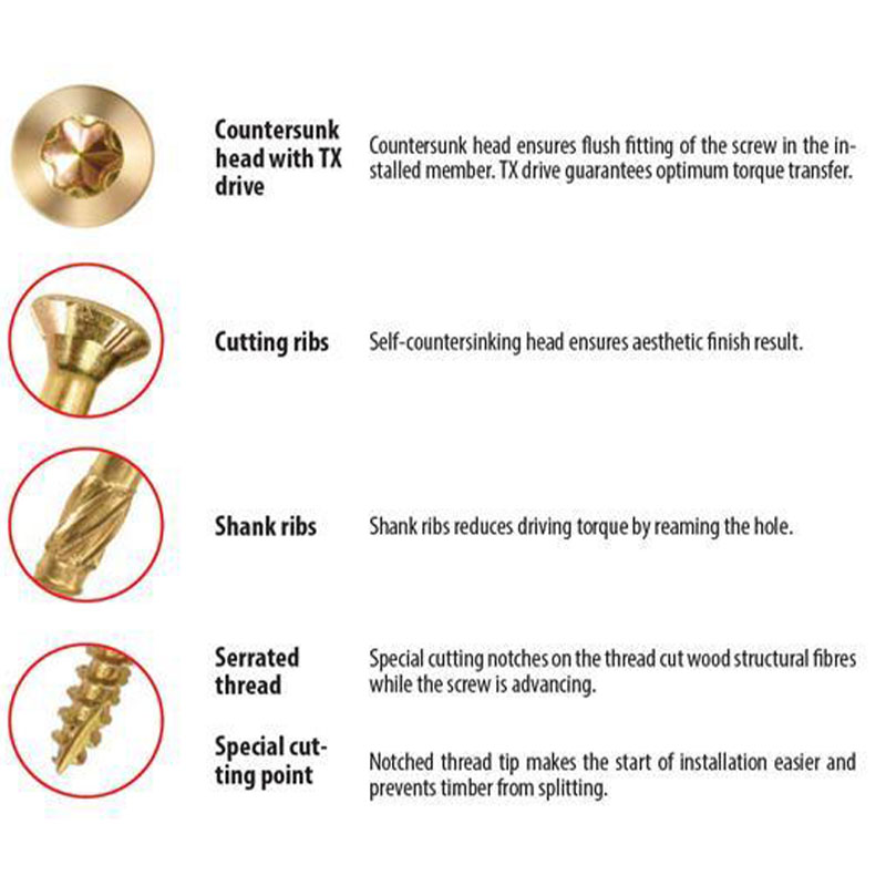 1. The Chipboard Screw is also called Screw for Particleboard or Screw MDF. It’s designed with a countersunk head ( usually a double countersunk head), a slim shank with an extremely coarse thread, and a self-tapping point.